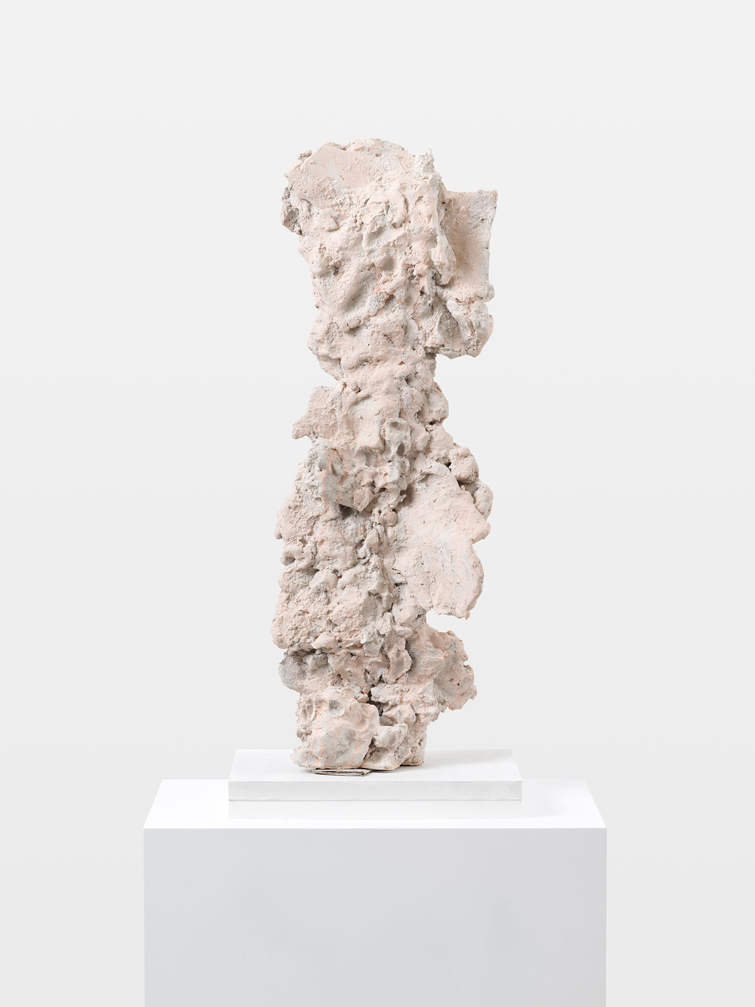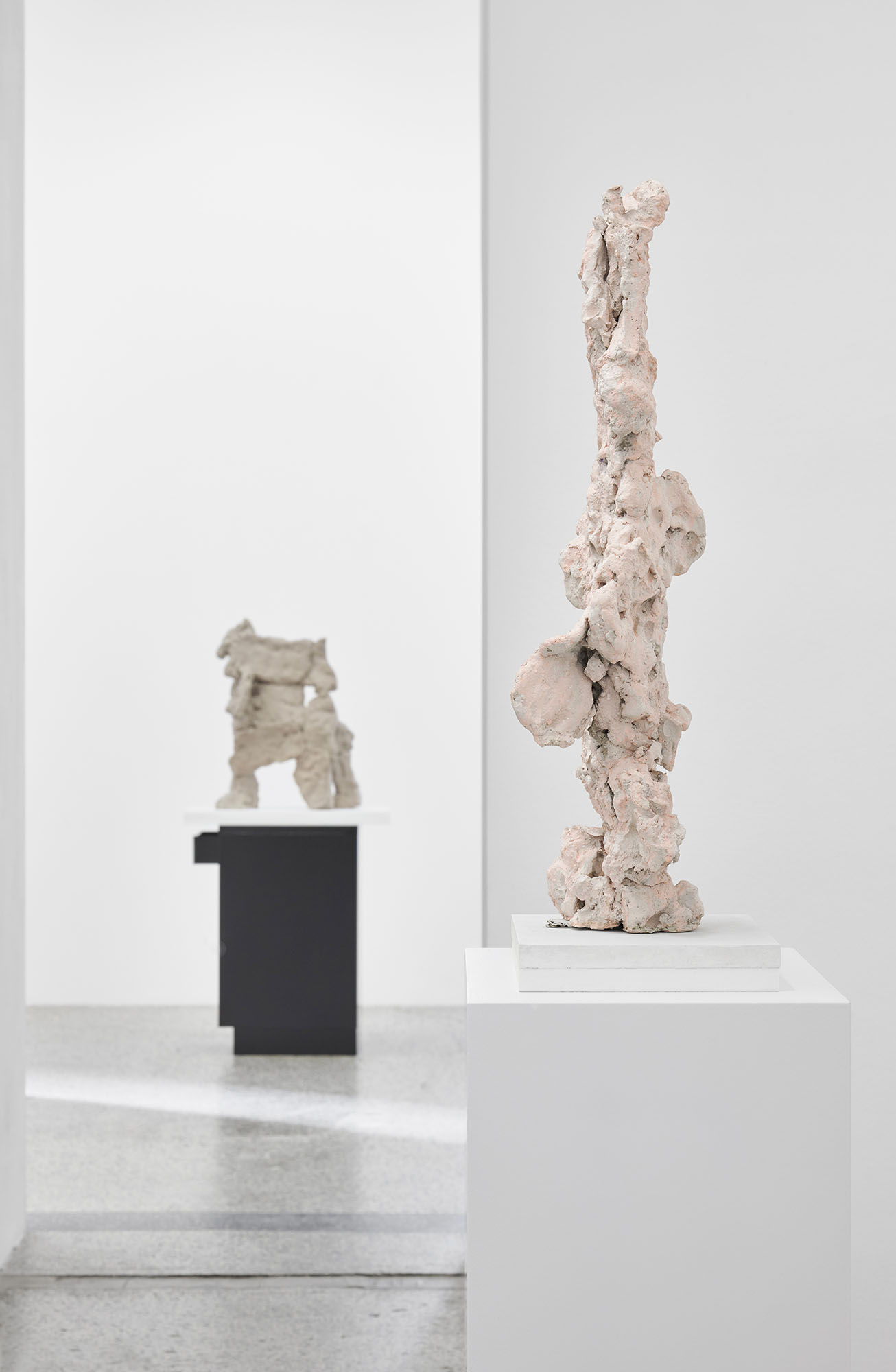 A rhythm of incorporation and release permeates Ulrike Schulze’s works like breath. In the exhibition Inspire Expire, it seems as if the rigid, fragile bodies are imbued with a monstrous vitality. Each breath is accompanied by an invigoration and a loss. In this way, these bodies and the traces inscribed on them resonate with the human, living body, yet the compositions of raw materials such as modeled, fired ceramics, wood, bronze, and glass elude immediate classification. The interplay of meaning assignment and radical devaluation shapes the perception of the works. The eye feels rather than recognizes. The fine, glazed paint and the modeling of the material take place on the same preverbal level. Here, color is not an addition but part of the formation, merging with the surfaces.