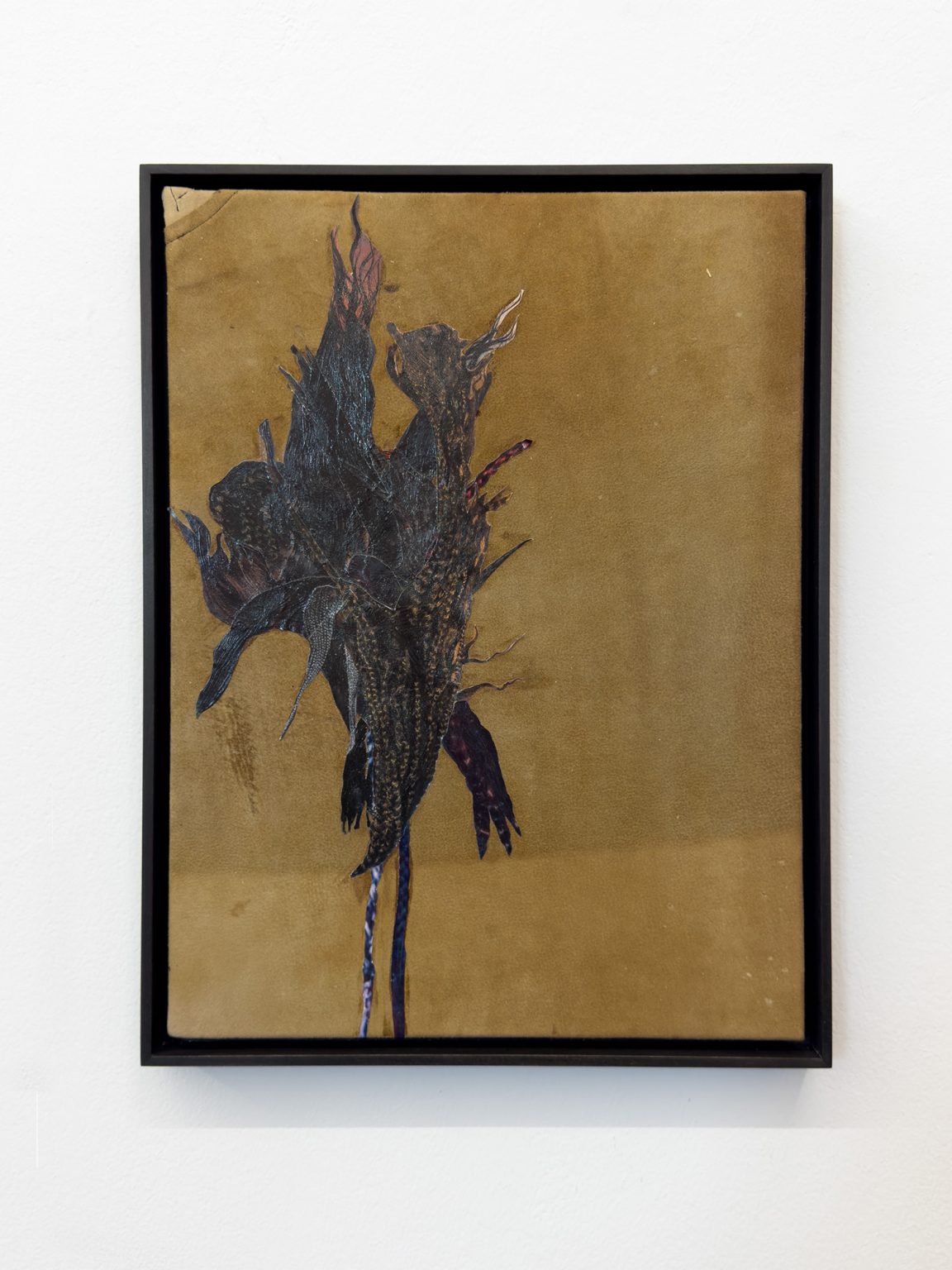 „The collages on leather refer in a more abstract way to the body and the tone of skin.