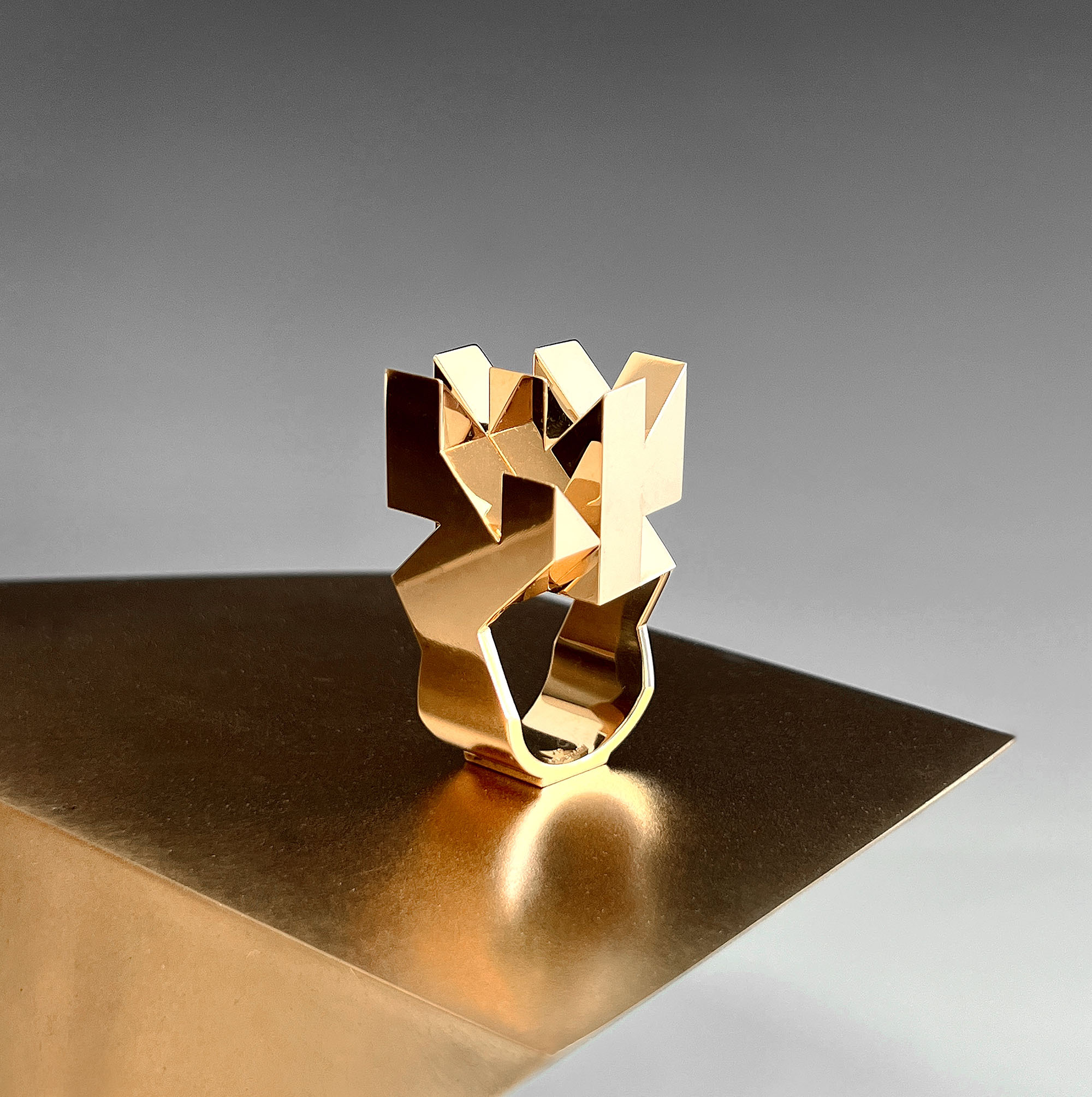 ‘caRRieR’ – the Jan Albers ring in 10 unique pieces is the artist’s first jewellery sculpture. Made of gold, the ring references Albers‘ characteristic spatial reliefs. Its geometric complexity and sculptural presence clearly locate it in the artist’s language.