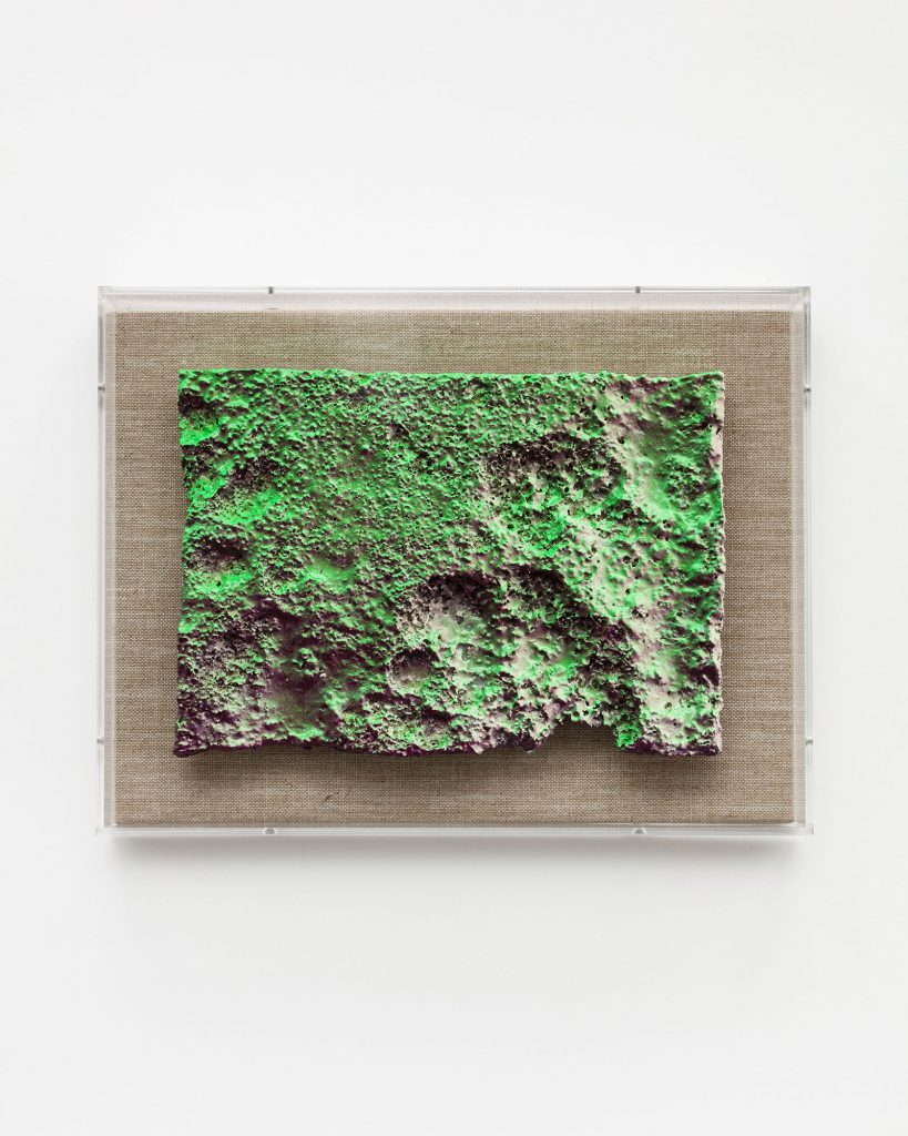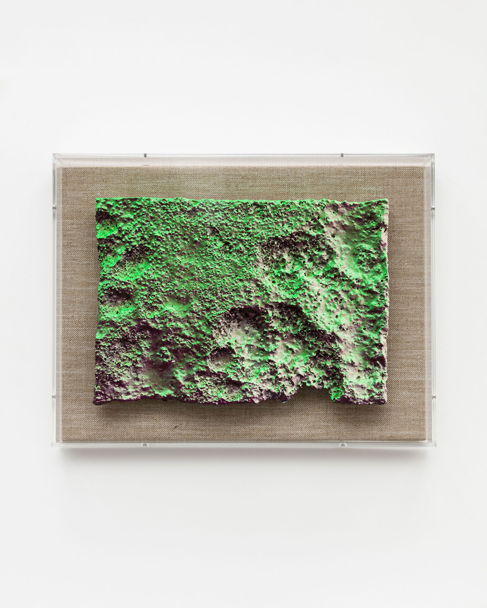 Spray paint, epoxi resin on polystyrene & fabric, wood, acrylic glass box, 29 x 38 x 9 cm